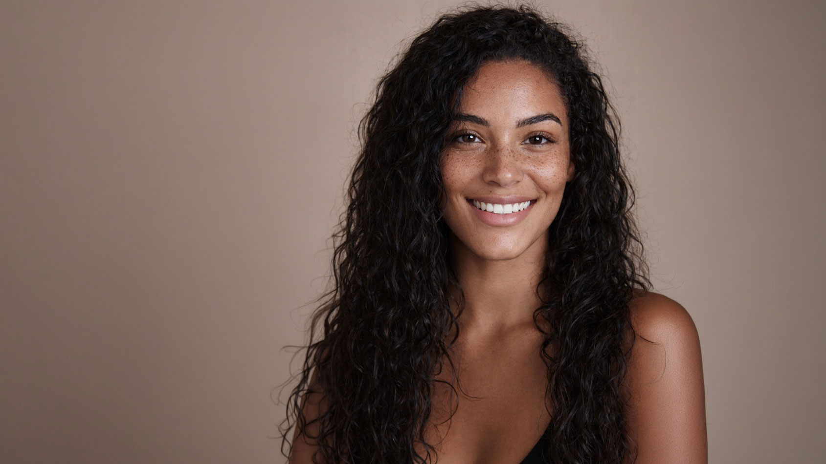 Drei lächelnde Frauen mit natürlichem Haar und entspannter Kleidung vor einem hellbraunen Hintergrund.