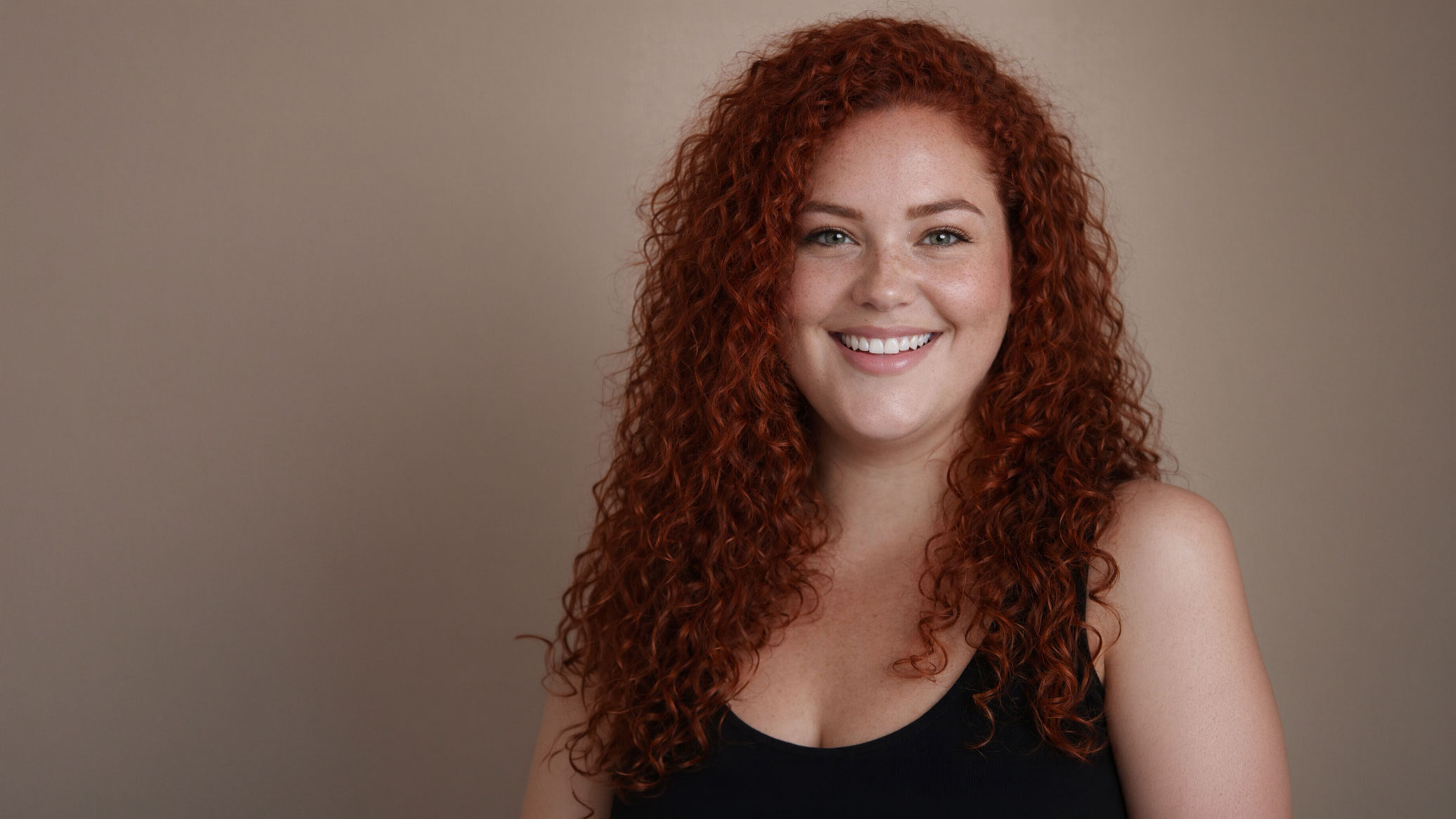 Porträt einer lächelnden Frau mit kurzen lockigen Haaren, großen goldenen Creolen und einem orangefarbenen einseitigen Oberteil vor einer hellen Wand.